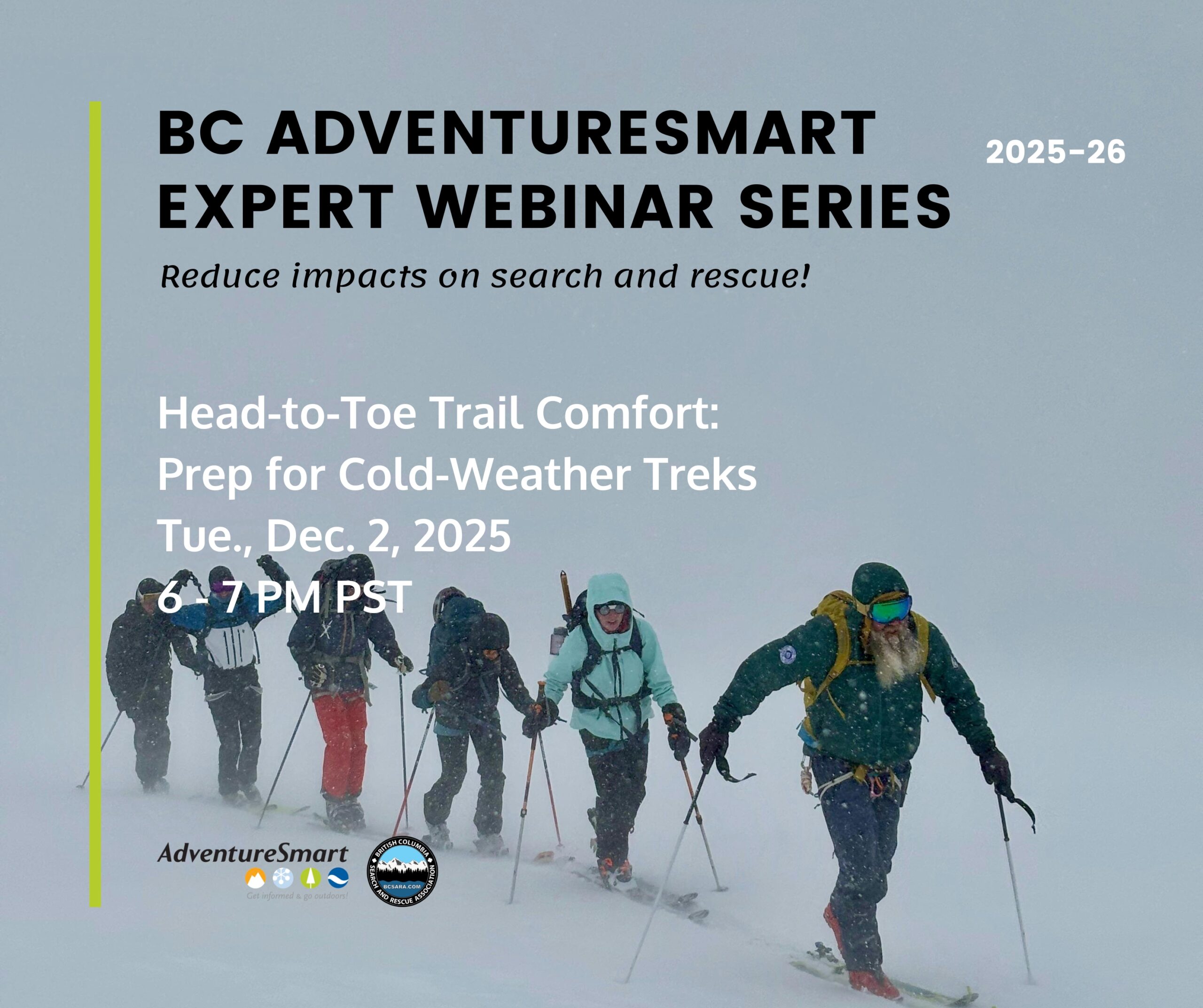 Cold-weather adventures can be rewarding — if you’re prepared. In this webinar, discover how to dress, layer, and gear up from head to toe to stay warm, dry, and comfortable on the trails. Learn practical tips for managing moisture, choosing the right fabrics, and keeping your energy up so you can enjoy winter hikes safely and with confidence. Special guest Canada West Mountain School and a BC SAR Manager.