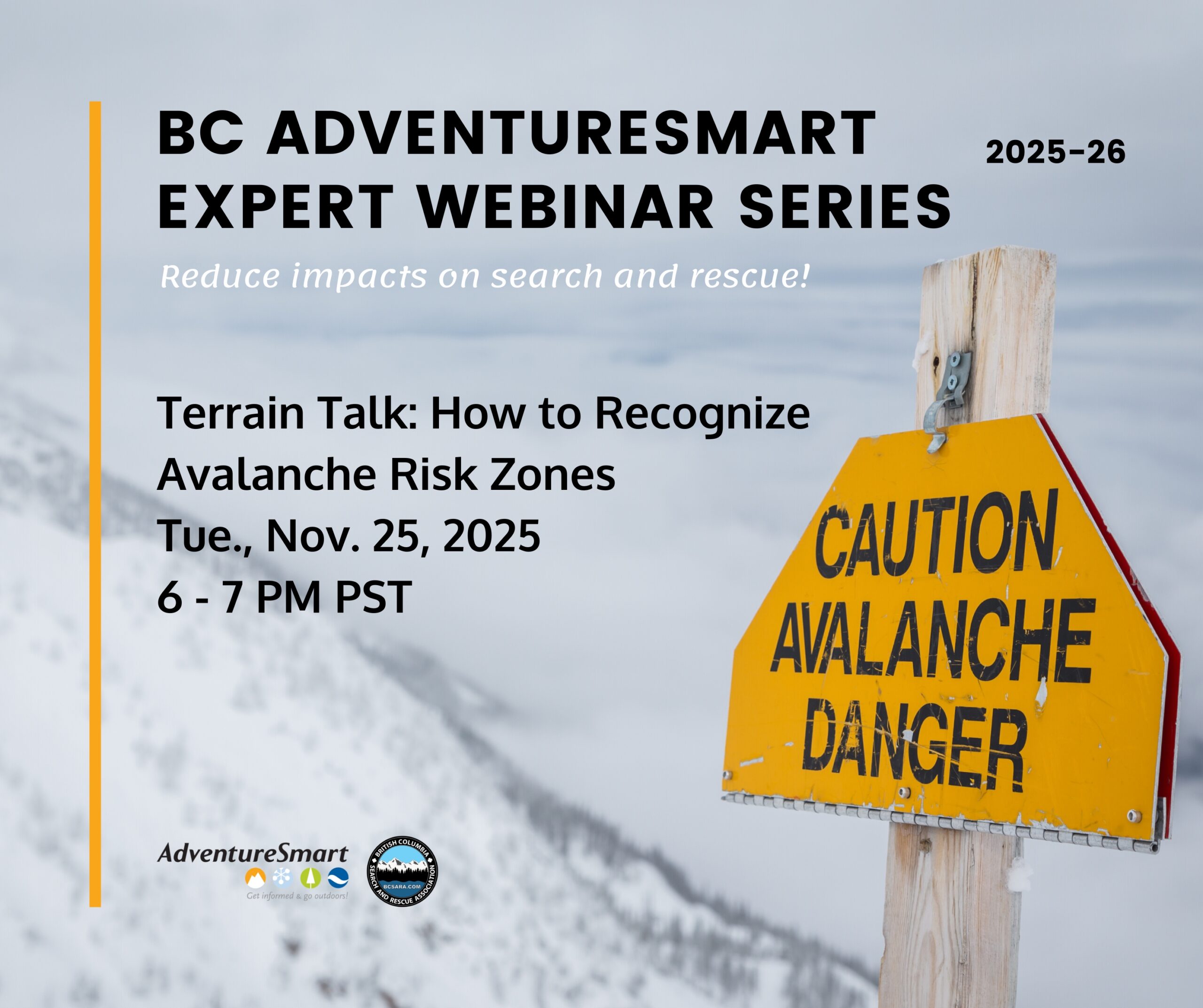 Understanding the landscape is key to staying safe in the backcountry. In this webinar, learn how to identify terrain features that increase avalanche risk, spot warning signs in the snowpack, and make smarter decisions before and during your adventure. Build your knowledge, boost your confidence, and be better prepared to travel safely in BC’s winter mountains. Special guest Avalanche Canada.