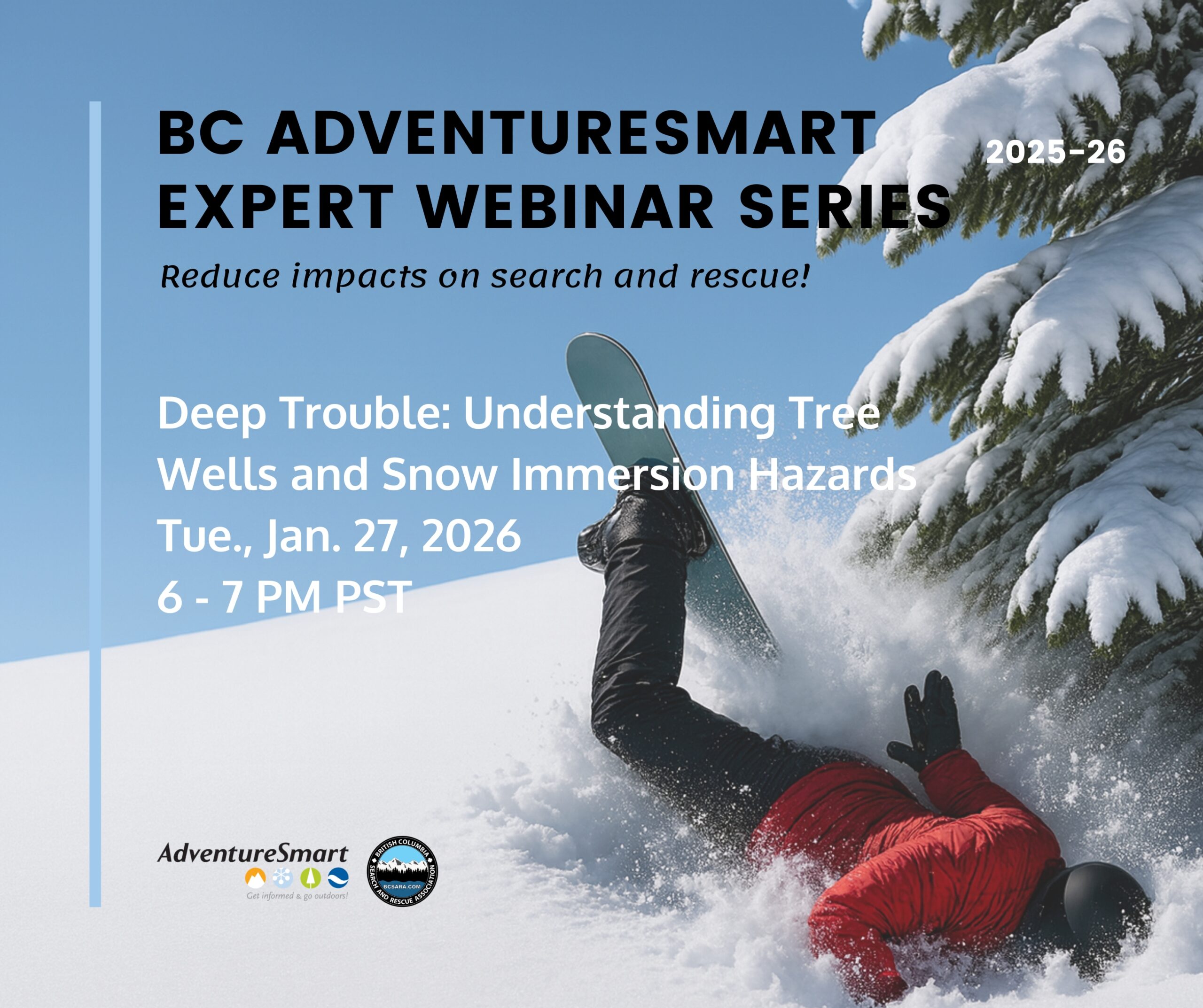 Tree wells and snow immersion incidents are hidden dangers that every skier, snowboarder, and backcountry traveller should know about. In this webinar, learn how to recognize risk zones, understand what makes these hazards so dangerous, and pick up practical strategies to prevent and respond to them. Stay informed and stay safe while enjoying BC’s winter mountains. Special guest Canadian Ski Patrol.
